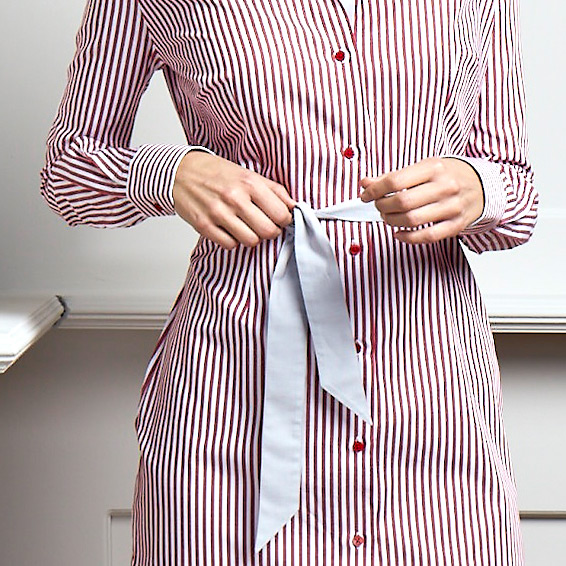 Wenn Gürtelschlaufen gewünscht sind, werden diese immer im Hauptstoff, passend zum Blusenkleid, produziert. So kann die Kundin das Kleid auch mal ohne Gürtel tragen.